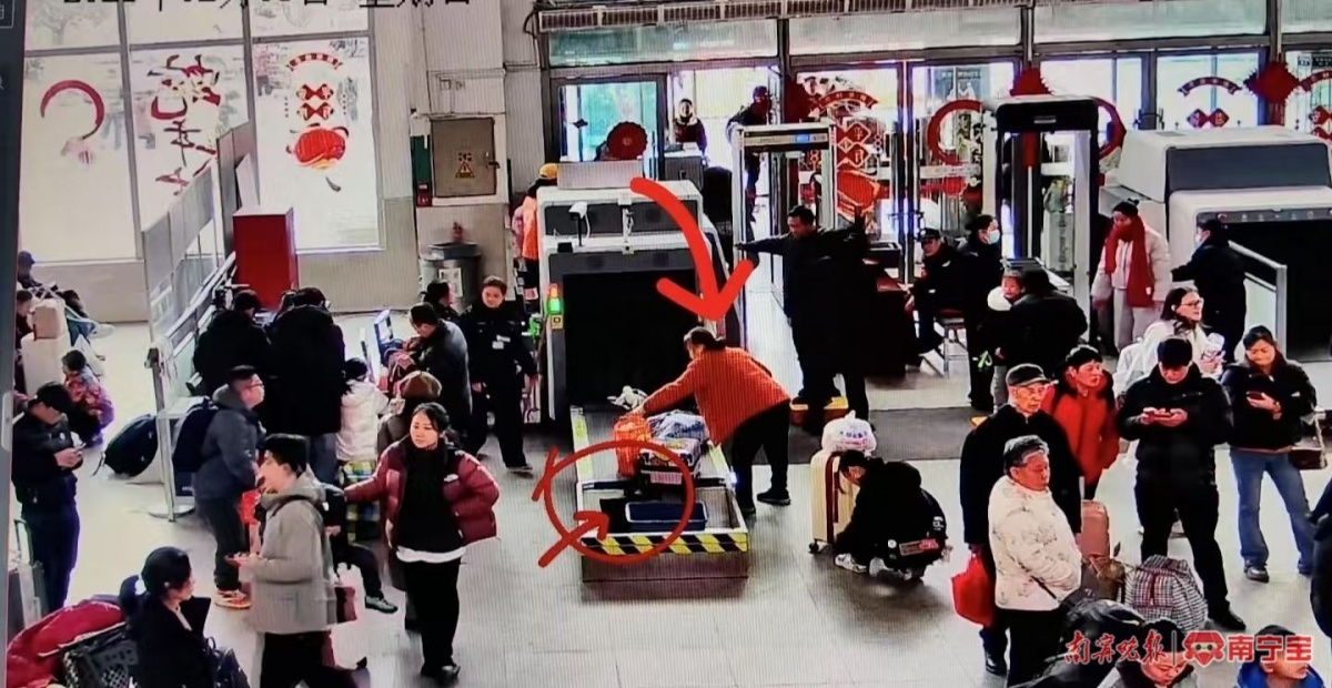 工作产生当日,国铁南宁局桂林车务段全州南站迎来了客流顶峰。15时50分,安检员在安检仪上发现了一个被忘记的黑色挎包,当即向车站值班人员报告。工作人员仔细检查包内物品后,便在候车室播送失物招领信息。不一会儿,一位身穿红衣的白叟仓促赶来服务台招领挎包。