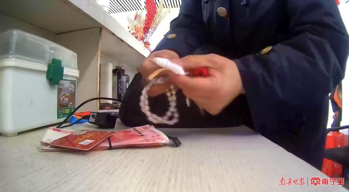 本来,这位六旬白叟与孙女一起乘坐当天G1503次列车从全州南站回来南宁东。在过安检时,因为行李较多,不当心将挎包忘记在安检仪上。随后,工作人员与白叟核对并清点了包内物品。